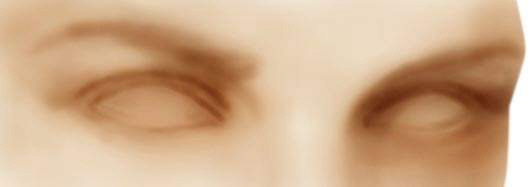 5.用喷枪画出眼白,这时候的眼睛看起来还是木呆呆的,所以接着就要开始深入细节的工作了。用喷枪把眼皮和眼睑颜色加深,因为画的是外国人的眼睛,眼窝特别凹陷,眉弓则突出,所以眼窝处的阴影重。用画笔工具画出双眼皮的厚度,注意一些细节的变化,用稍大的笔刷,就像女孩子画眼影似的从眼角处向斜上方刷。下眼线可以用减淡工具提亮。点出高光现在眼睛神气多了吧(图5)。