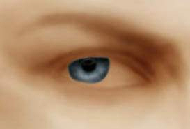 4.接着,可以在眼眶里加上眼珠了。继续新建层,用钢笔工具勾出眼珠后,按“Ctrl+回车”(钢笔转换为选区)。按“Ctrl+Alt+D”设置羽化值为1 (羽化的目的是为了让边缘看起来不那么生硬)。然后选个你喜欢的颜色来填充。保持选区,挑个深色,用喷枪把眼珠周围一圈加深。用涂抹工具,在眼珠内从外向里,拖出一丝一丝的感觉来(可别把眼珠拖得变形了)再在中间点出适合大小的瞳孔。眼睛也有反光的哟,用减淡工具在靠近瞳孔的地方提亮(图4)。