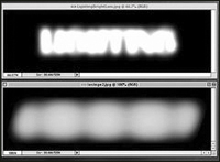 为了制作发光的招牌底板,我们不仅要模拟透射光源,还要模拟字母模型边缘扩散的光线洒到底板的效果。光设置反射系数显然不够,我们还得回到Photoshop中做两个发光贴图,如此图所示,下方是招牌透射效果,上方则是字母边缘散射效果(如图5)。