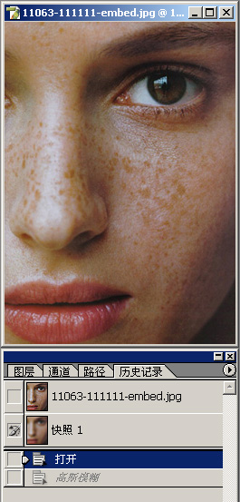 选中历史记录笔刷工具,不透明度我用50%,此处也是随意,值越低,越容易调整,但降低速度,值高则反之。还有眼嘴等轮廓清晰的地方不要碰。