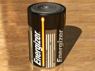 再来一幅说明反射影象的重要作用。看看这个电池,也很简单,为什么就是比2D软件做得更有真实感?仔细观察一下,唯一在2D制作里没有加上的就是光滑表面对周围环境的反射。电池顶部有模糊的反射效果,侧表面有淡淡一层对地板的反射影象,这就是彻底加强真实感的秘密,实质上是暗示其表面的光滑而让观众心理接受,可以利用这一点很好地加以欺骗。