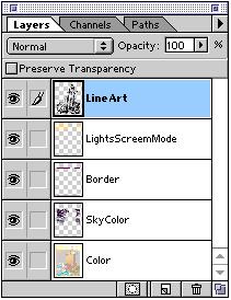 在这个例子中,在LineArt层之下,图像还加入了边界和天空层。边界是在Photoshop中创建的,而天空则是从一幅很早的黑白雕版画扫描而来。