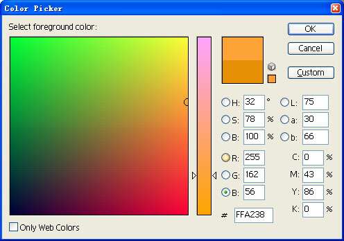 2、将鼠标移动到工具条的前景色设置按钮上,并用鼠标双击之,在随后出现的颜色设置对话框中,将当前编辑区域的前景色设置为金黄色,具体数值如图2所示;接着单击OK按钮来完成颜色的设置,然后同时单击键盘上的 Alt+Delete复合键,来将当前新建的文件填充为金黄色;