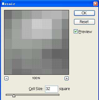 图34、再返回到图层面板中,将Layer1图层复制两次生成Layer2图层和Layer3图层;然后用鼠标选中Layer1图层,并依次执行菜单栏中Filter/ Pixlate/Mosaic命令,随后大家将看到一个如图4所示的设置对话框,在该对话框中将CellSize大小设置为32;