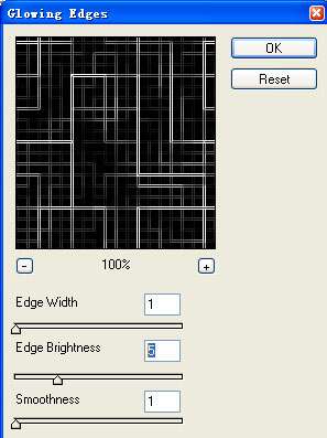 图56、接着用鼠标选中合并后的Layer1图层,然后在Photoshop程序的菜单栏中依次执行Filter/Stylize/Find Edges命令,随后程序将出现一个如图6所示的画面,该画面勾勒出当前编辑区域的边缘效果;在该效果画面上,大家继续单击菜单栏中的Filter菜单项,从随后出现的子级菜单中依次选择“Stylize/Glowing Edges”命令,Photoshop程序将打开一个如图7所示的参数设置对话框;