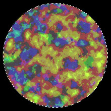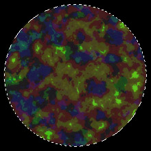 3.新建一层,按住Shift键,用椭圆工具画一个正圆形。设置前景色为RGB(138,202,30),背景色为RGB(68,16,123),用前景色填充选区。执行渲染滤镜>分层云彩命令,连续6次,如图01所示。(图01)