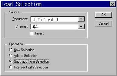 7.回到RGB Channel下,使用(Select)-(Load Selection)先叫出Channel 5,再叫出Channel 4,而Operation需选为Subtract from Selection。