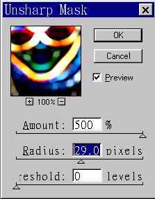 6.使用(Filter)-(Sharpen)-(Unsharpen Mask),将Amount设到最大,Radius为适中。
