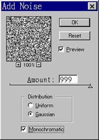 2.使用(FIilter)-(Noise)-(Add Noise),Amount最大及Distribution选Gaussian来增加杂点。~Monochromatic不一定要
