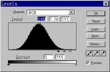 5.使用(Image)-(Adjust)-(Levels)来将Input中的黑/灰三角型调至右方以将画面去除多余的白点。