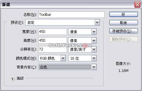 1、运行Photoshop CS中文版,新建一个大小为“450×450”像素、分辨率为72像素/英寸、背景颜色为白色的文件,输入文件名称“Toolbar”,具体设置如图1所示。