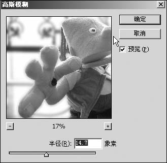 选取菜单命令“滤镜→模糊→高斯模糊”命令,在弹出的模糊界面,通过预览窗口调节模糊值,直到满意为止,如图3所示。