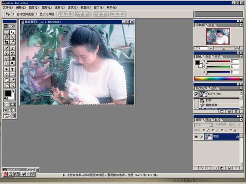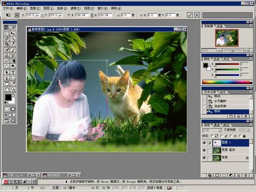photoshop"了,这里我们用photoshop 6.0中文版来进行图片的处理工作,其步如下:1、图1是一张传统照片通过扫描后变成的数字照片,在photoshop 6、0中打开,图像是一个抱着小猫的姑娘,因为背景有些零乱,觉得不够满意,想将它的背景进行变换。