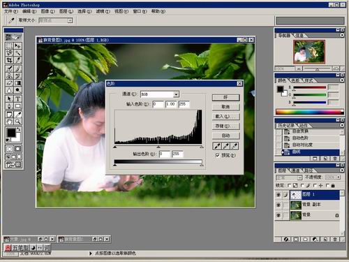7、调色彩。由于两张照片出自不同的地方,色彩,色调差别很大,必须进行仔细的色彩调整,这张照片上的人物太白,显然曝光有点过了,我们用photoshop6.0中的色彩调节来进行适当色彩、色调的调整。在photoshop6.0中,设置了多种调节方式,可以根据不同的需要进行不同的调整,具体的操作方法是:点击菜单栏的图像菜单,在下拉菜单中点击调整,在这个色彩调整栏中一共分有四部分的,第一部分中有六个选项,从上至下分别是:色度(色阶)调节、自动色度调节、自动对比度调节、曲线调节、色彩平衡调节、亮度和对比度调节。色彩调节比较复杂,这里我们只选择自动色度调节和自动对比度的调节。方法直接点选自动色度调节,photoshop6.0会自动对照片的亮度和暗部的色调进行进行智能调整,它能分析照片中最亮和最暗的像素,从而进行调整,使图像中的亮度分布更加均匀,同时消除部分部分不正常的亮度,以达到使图片色调鲜艳、明快的目的。对比度,与传统的照片一样,是指图像中亮色和阴影区的反差比例,对比度低的照片,缺乏明暗界限,难以突出主题,看上去朦胧一片;而对比度高的照片,却缺乏过度色彩,看起来视觉反差过大,对比效果强烈,给人感觉很生硬。因此对对比度的调整可以使照片看起来更加自然、明丽、尝心悦目。方法是点选菜单栏的“图像”,在下拉菜单中选“调整”项中的“亮度/对比度”就可以了。图7 便是色度和对比度调整后的照片。