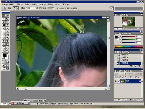 8、细节调整。调好色彩后,某些细节还不够精美,此图的头发不够流畅,有锯齿状,我们将它修复流畅一些。首先使用photoshop6.0提供的