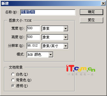 1、运行Photoshop程序,打开Photoshop7.0的主操作界面,在该界面的菜单栏中单击“文件”菜单项,从弹出的下拉菜单中选择“新建”命令,就能打开如图1所示的新建对话框了;在该对话框的名称文本框处,大家可以输入“视窗图标”这个图象名字,同时在宽度、高度设置栏处输入新建图象的宽度为500像素、高度为500像素,将图象的分辨率设置为96pixels/inch;在颜色摸色设置栏处,将图象的显示模式设置为RGB color,并在文档背景设置栏下,将图象的背景颜色选择为“透明”,设置好这些参数后,单击该对话框中的确定按钮,返回到主编辑界面;