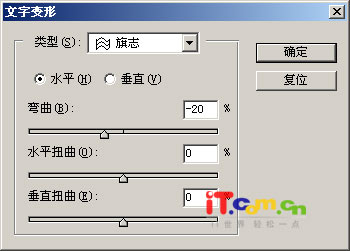 4、重新返回到图层窗口中,用鼠标选择好Layer 1图层,接着将鼠标移动到主界面左边工具条上的文字输入按钮上,用鼠标左键单击之,并将Layer 1图层中的“■”文字符号选中,然后用鼠标单击工具条中的文字变形按钮,来打开一个如图4所示的文字变形效果设置界面;