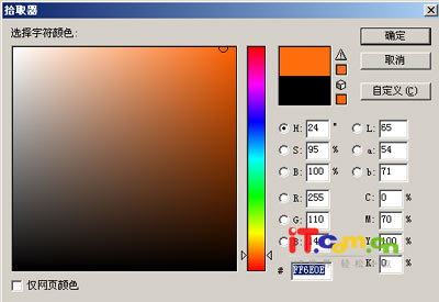 6、接着大家再对变形后的“■”文字符号进行填充颜色,填充时可以先选中各图层中的文字,然后用鼠标单击“设置字符颜色”的按钮,在随后打开的如图6所示的颜色设置对话框中,将Layer 1图层、Layer 2图层、Layer 3图层以及Layer 4图层中的文字符号颜色值依次设置为#FF6E0E、#A8DE40、#9E0AFB、#FBF812,设置好所有图层的颜色后,再用工具条中的移动工具将各图层中的文字位置调整适当,最后将得到图7所示的效果;