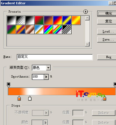 7、为了能给各图层中的文字再加上光影效果,大家可以先在Layer 1图层中,用魔棒工具选择其中的文字符号,进行颜色的填充。将鼠标移动到图层属性面板中,并点击图层面板上的调整钮,从随后打开的菜单中选择渐变命令,这样大家就能打开一个如图8所示的渐变填充设置界面了;在该界面中,大家必须将角度设置为0,将渐变样式设置为“直线”;接着用鼠标双击渐变颜色设置项,程序就能打开如图9所示的渐变颜色设置对话框,在该这个界面中,大家应该将渐变颜色设置为合适的数值,具体参数如9所示;