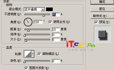 11、返回到图层窗口中,并用鼠标左键双击图层,随后程序将打开一个图层效果参数设置对话框,大家可以在这个图层样式对话框中选中投影效果,并将该效果画面中的“混合模式”设置为正片叠底;将投影的距离设置为“15像素”,同时将该效果画面中的“清除锯齿”以及“图层外投影”选项选中,其余的参数按照如图11所示进行设置;