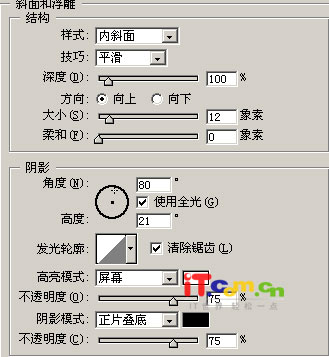 12、再双击图层,打开图层效果参数设置对话框,并在该对话框中选中“斜面和浮雕”效果,同时将该效果画面中的“样式”设置为内斜面;将斜面的大小设置为“13像素”,同时将该效果画面中的“清除锯齿”以及“使用全光”选项选中,其余的参数按照如图12所示进行设置;设置好图层的相应效果参数后,就能得到如图13所示的效果图了;