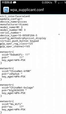 最后我们再在wifi目录里找到wpa_supplicant.conf文件,然后使用文本查看器打开查看,在这里变即可查看到所有之前我们手机连接过的Wifi密码,如下图所示: