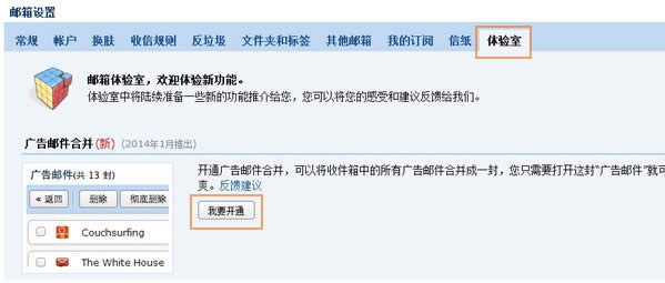 在体验室中,就能看到“广告邮件合并”的选项,点击“我要开通”。