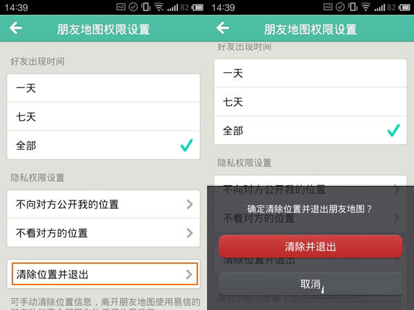 在朋友地图底部点击“设置”按钮,可以对“朋友地图权限”进行设置,在这里用户可以对隐身的权限进行设置,如果用户不想再使用朋友地图功能,可以点击“清除位置并退出”进行位置的清除。