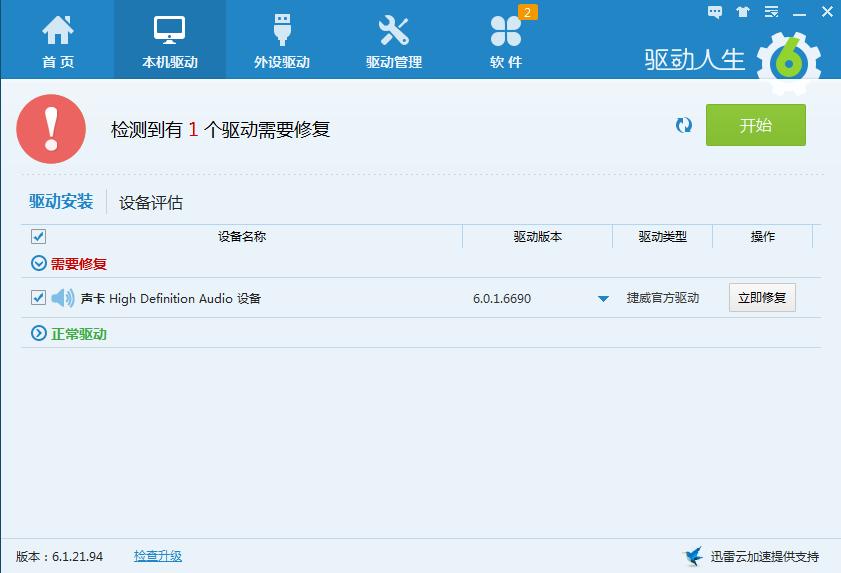 先打开驱动人生的客户端,点击本机驱动给所有的驱动做一个检测。小编为了让大家有更直观的感受,手动卸载了声卡。经过检测,驱动人生发现声卡驱动有问题,由于驱动人生是主打一键安装修复的,所以我们只需点击开始就行。