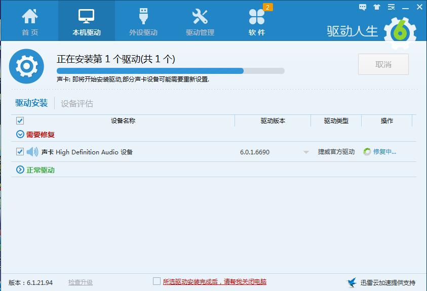 点击开始后,声卡就会自动修复安装。不需要再额外勾选了,即使是电脑小白也只需跟着提示一步一步点击就可以了。