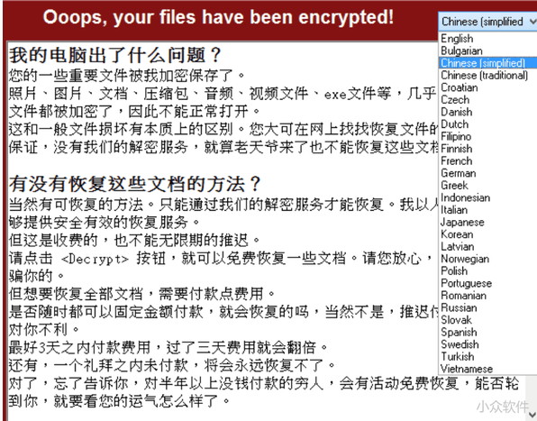 据介绍,这个名为“永恒之蓝”的勒索病毒,伪装成Windows系统文件。用户一旦感染,电脑中大多数文件类型均会被加密。病毒使用RSA非对称算法,没有私钥就无法解密文件。黑客以此向用户勒索价值300或600美金的比特币。