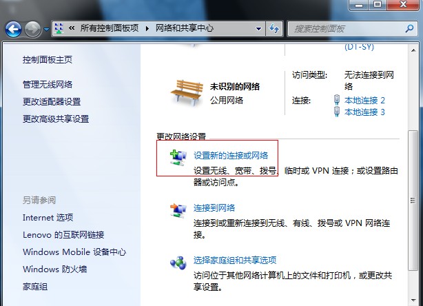 二、在网络和共享中心中选择“设置新的连接或网络”,如下图2