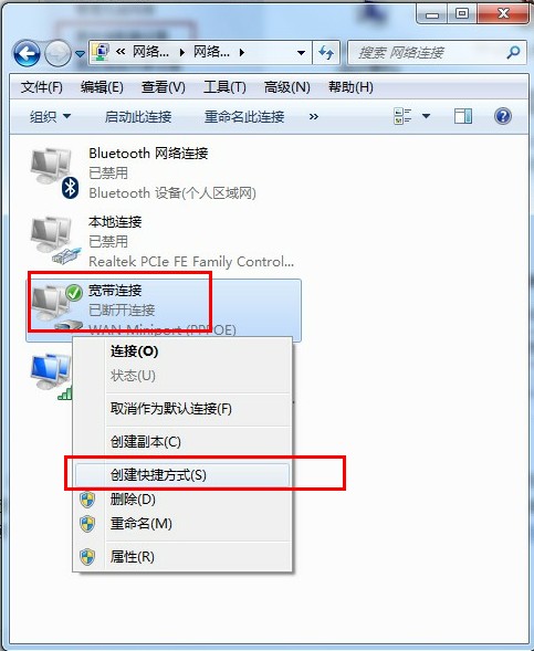 2、在“宽带连接”上点击右键选择“创建快捷方式”即可。如下图8所示。
