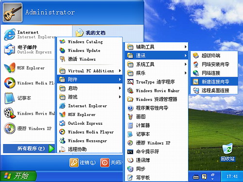 点击“开始”指向-->所有程序-->附件-->通讯-->新建连接向导,如下图1