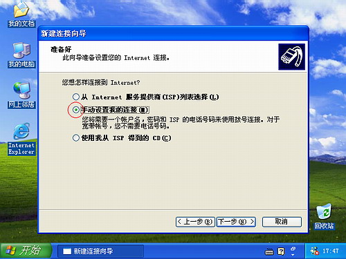 因为目前联通和电信等的宽带连接都是要用到用户名和密码来登陆的,所以这里我们选择“手动设置我的连接”,如下图5所示