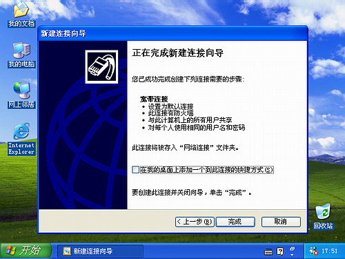 然后点击“完成”,这时桌面上多了一个宽带连接图标,如下图12所示。双击它即可连接上网。