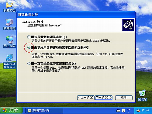 联通和电信等的宽带连接都是要用到用户名和密码来登陆的,所以这里我们选择“用要求用户名和密码的宽带连接来连接”,如下图7所示