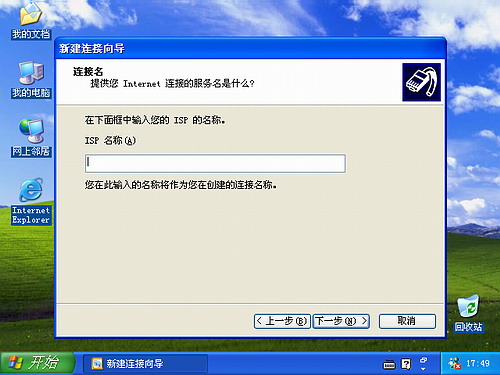这里需求输入ISP名称,可以随竟为这个连接取一个名,如果不取名,系统默认将这个连接命令为“宽带连接”,建议直接点击“下一步”,出现如下图9所示。
