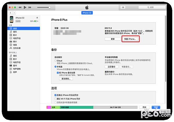 3. 在 iTunes 的设备信息界面,按住 Option 键(Windows 用户在按住 Shift 键),单击「恢复 iPhone...」按钮;