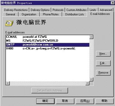 6.在"E-mail addresses"属性框中,我们可以查看用户的E-mail地址是否正确。Exchange Server自动为新用户映射了4种类型的地址,分别为CCMAIL地址、Microsoft Mail地址、SMTP地址和X.400地址。对于Internet邮件用户而言,应当查看SMTP地址是否映射为 pcworld@ccw.com..cn。如果不是,可以在这里进行修改,如图7所示。