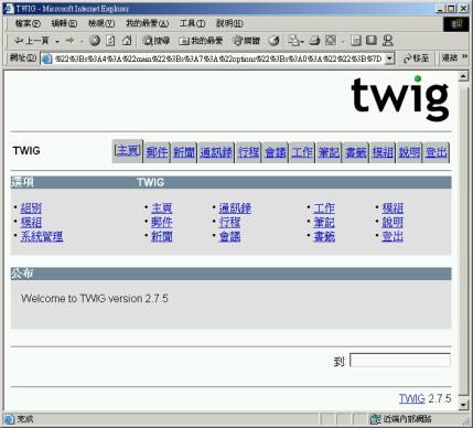 利用一组系统中已存在的帐号登入,你就可以看到下列的画面。twig 预设会有 主页 | 邮件 | 新闻 | 通讯簿 | 行程 | 会议 | 工作 | 笔记 | 书签 | 模块 | 说明 | 注销 等选项,你可以一一加以点选使用。个人环境的设定可在"模块"选项中进行修改。