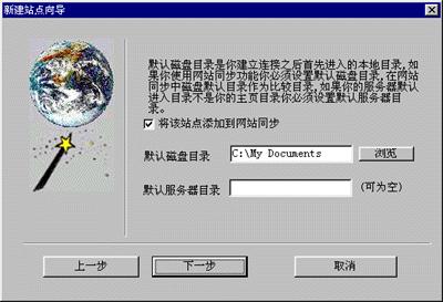 安装网络传神很简单,可以闭着眼睛一直按下回车键来轻松搞定。第一次运行它的时候将有站点设置向导出现帮助我们设置自己的FTP站点,这主要包括站点名称、服务器地址、用户名和口令等内容。不过比较独特的一点是增加了默认磁盘和服务器目录功能,设置它们之后可以用于设定主页文件在本地硬盘上存放的目录和服务器上的目录,这样每次运行网络传神之后程序将自动打开这两个目录以方便我们的操作。(图1)