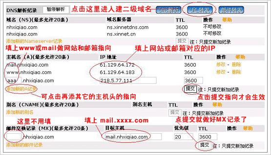 如果您要正常使用企业邮局,那么您应该作MX记录解析,也就是邮件交换记录解析。 要使您的邮箱能够正常收发信,应该执行两个操作,一个是把mail.你的域名.com解析到企业邮局所在服务器的IP地址上(假设为61.129.64.172),另一个则是增添邮件交换记录。
