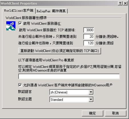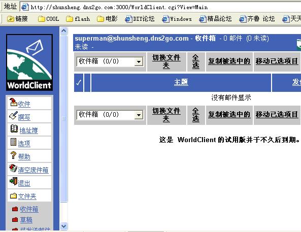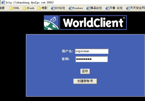 启用WorldClient服务器这个选择一定要选择打勾,下面的3000就是WEB页面的端口号,找一个空闲的端口号添上就可以了,端口很多的,不是吗?就拿默认断口3000为例吧,我的ADSL上网的机器动态域名是shunsheng.dns2go.com