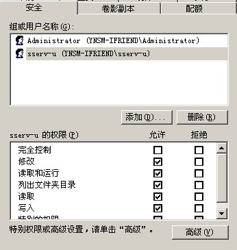 图14:WEB目录所在盘的权限设置至此,设置全部结束。现在的SERV-U设置是配合IIS设置的,因为和IIS使用不同的账号,WEB用户就不可能访问SERV-U的目录,并且WEB目录没有给予SYSTEM权限,所以SYSTEM账号也同样访问不了WEB目录,也就是说,即使使用MS