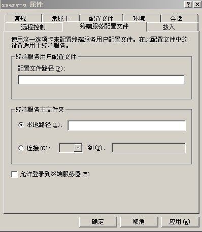 图9:从隶属于里删除USERS组从“终端服务配置文件”选项里取消“允许登录到终端服务器(W)”的选择,然后点击确定继续我们的设置。(见图10)