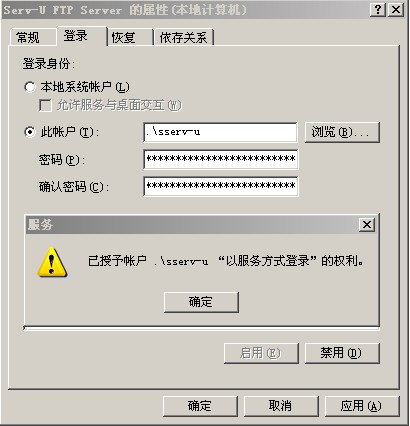 然后点击“登录”进入登录账号选择界面。选择刚才建立的系统账号名,并在下面重复输入2次该账号的密码(就是刚才让你记住的那个),然后点“应用”,再次点确定,完成服务的设置。(见图11)