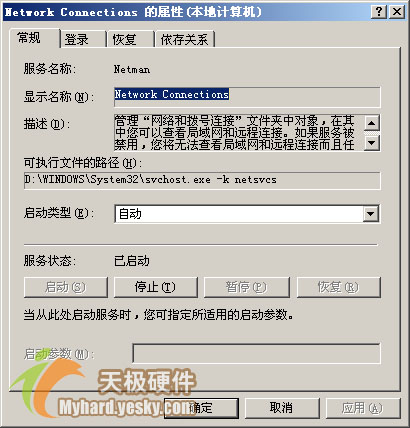 小提示:倘若在网络连接列表界面中,没有看到“本地连接”的图标时,你不妨依次单击“开始”/“运行”命令,在打开的系统运行对话框中,输入服务策略编辑命令“Services.msc”,单击“确定”按钮后,打开系统的服务列表窗口,双击其中的“Network Connections”项目,在随后出现的如图2所示的服务属性设置窗口中,检查“Network Connections”服务是否已经启动,要是没有的话,你可以单击“启动”按钮,然后从“启动类型”下拉列表中选中“自动”,最后单击“应用”、“确定”按钮,这样的话就能在网络连接列表窗口中,重新看到“本地连接”的图标了。