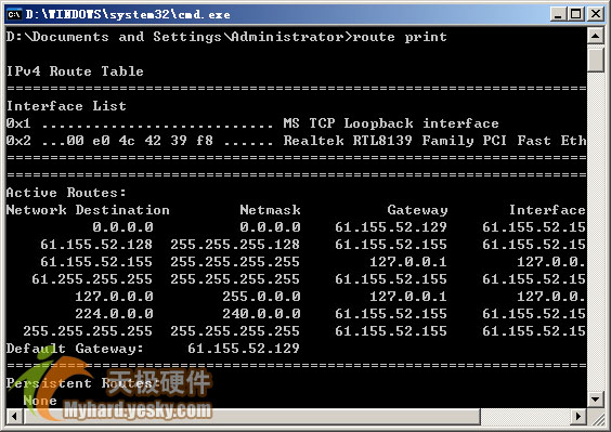接着在DOS命令行中,执行“Route PRINT”命令,随后你将在如图3所示的界面中,看到本地工作站中的路由表信息。要是发现其中没有通往“默认网关”的路由信息时,你可以通过Route ADD命令来增加一条到默认网关的记录,以后工作站就能自动与默认网关连接了。