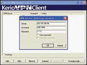 vpnclient.exe”下载Kerio VPN客户程序,安装后运行。在VPN客户程序对话框中点击“Add”按钮,弹出编辑VPN服务器对话框(如图2),在“Server”栏输入VPN服务器的IP地址 “Username”和“Password”栏中输入VPN账号和密码,最后点击“OK”按钮。